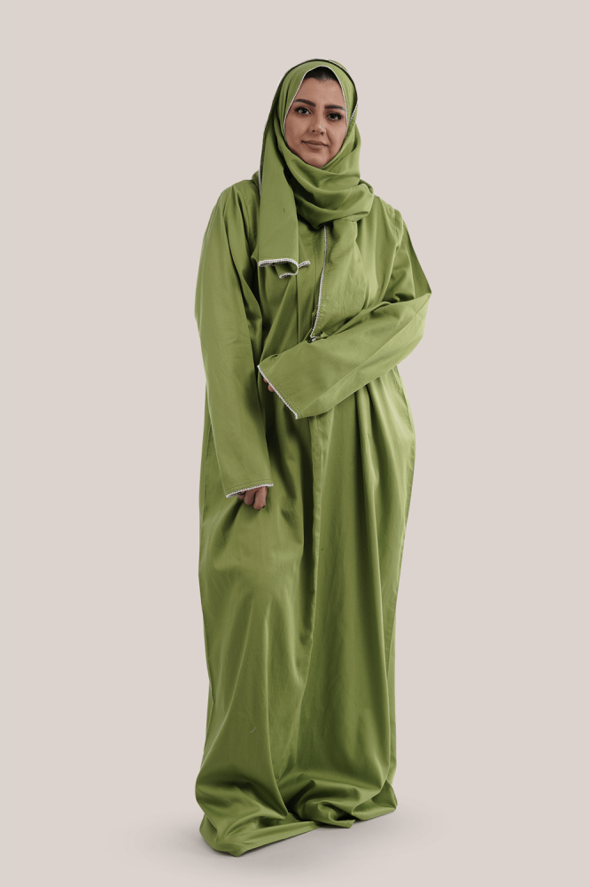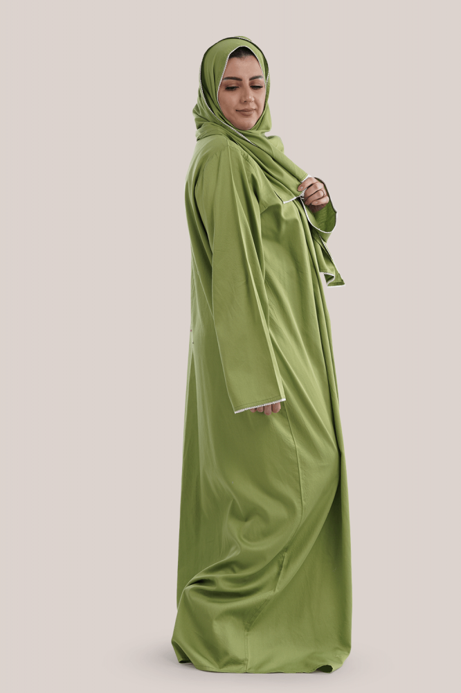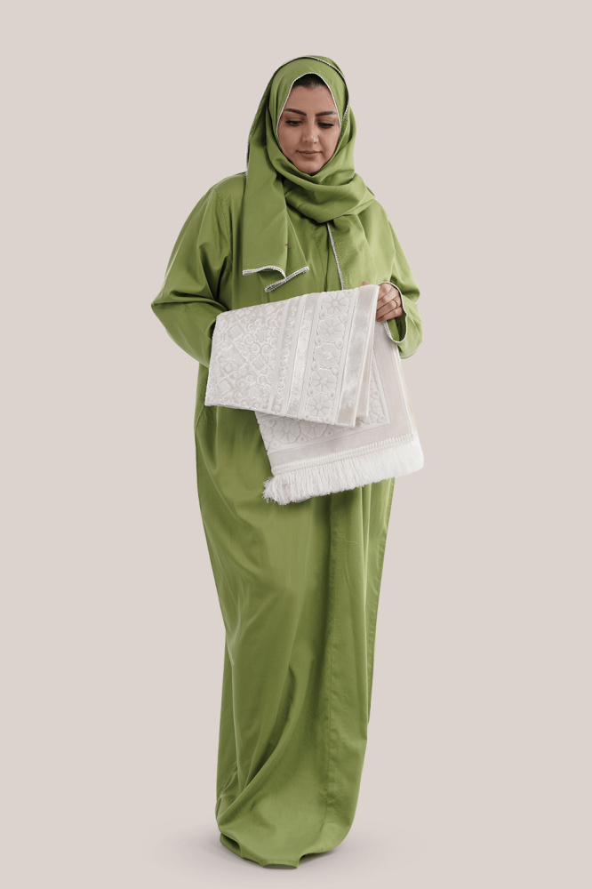 شرشف صلاة كنوز باللون الزيتي الفستقي يمنحك إطلالة راقية تنبض بالنضارة والهدوء، بخامة قطن حرير 100% وكلفة ناعمة ولمسة عملية بطرحة وسحاب.