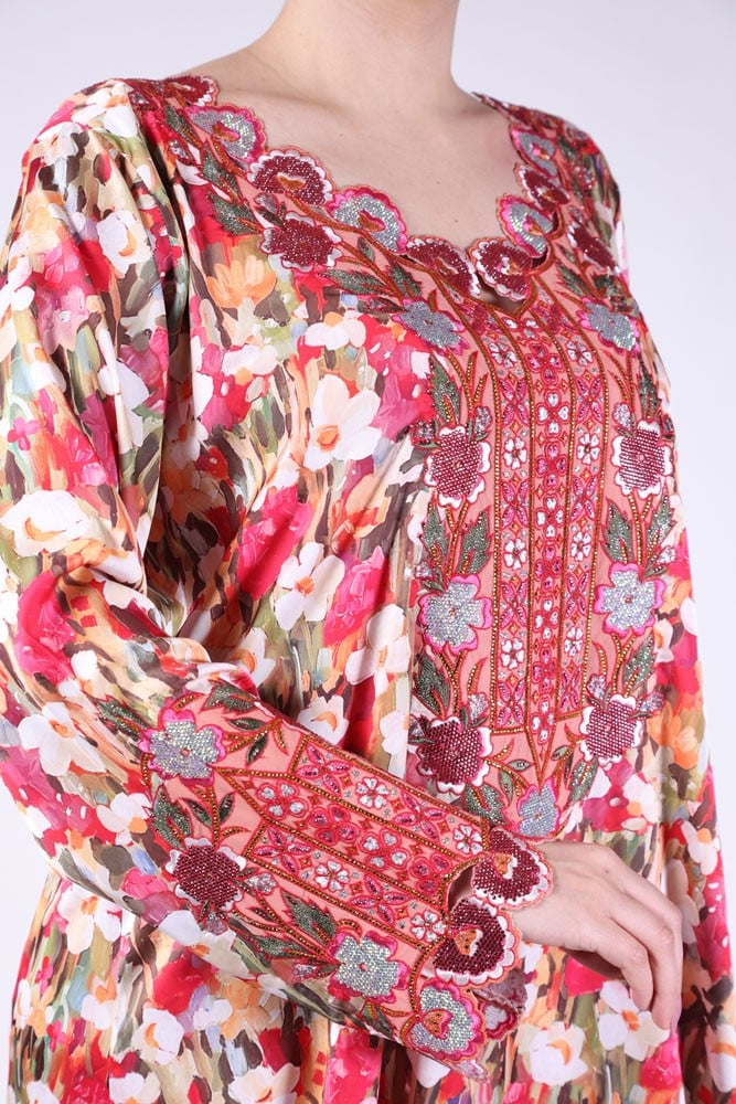 اختاري لمسة من الأناقة والجمال مع مخوار حرير مشجر المصمم بعناية فائقة ليمنحك إطلالة مشرقة ومتميزة. يتميز بتصميمه الفريد الذي يجمع بين النقوشات الرائعة والتطريزات الجميلة مع لمعة طبيعية تضيف إلى سحره ورونقه. خامته الحريرية الناعمة تمنحك الراحة والأناقة، مما يجعله الخيار المثالي لمناسباتك الخاصة.