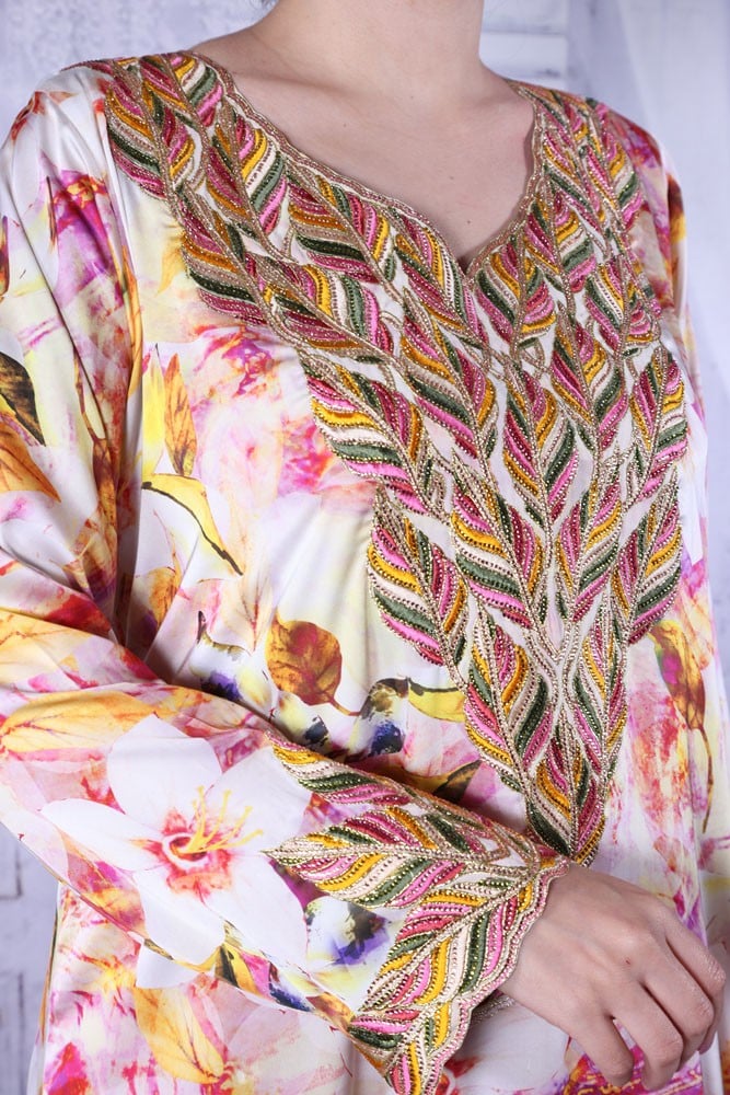 يتميز بتصميمه الفريد الذي يجمع بين النقوشات الرائعة والتطريزات الجميلة مع لمعة طبيعية تضيف إلى سحره ورونقه.