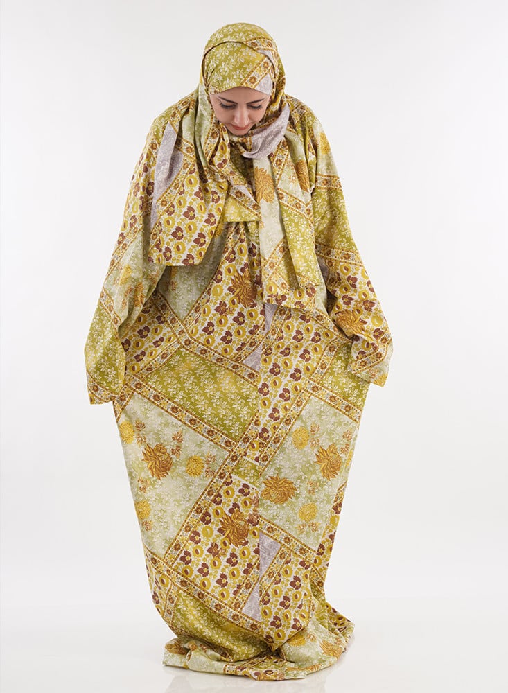 شرشف صلاة المشجر باللون الأصفر والبني من خامة القطن الحرير 100%، بتصميم عملي مع طرحة متصلة وسحاب مخفي، ليكون رفيقك المثالي في أوقات العبادة.