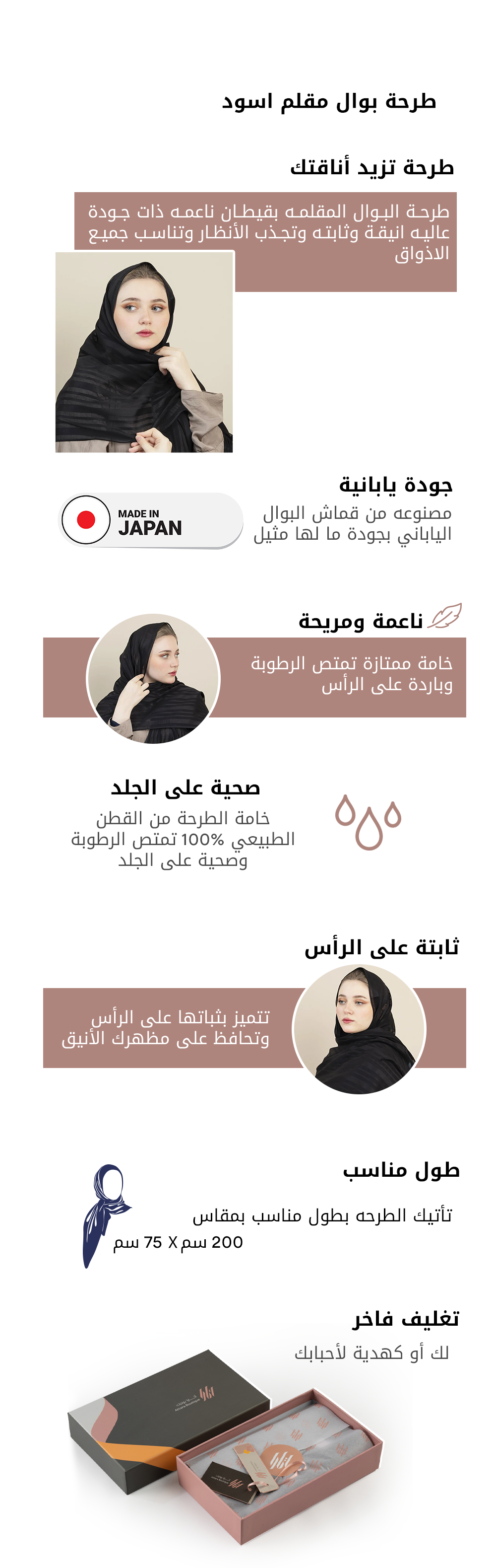 أبرزي جاذبيتك مع طرحة البوال المقلمة بقيطان المصنوعة من القماش البوال القطني 100%، بتصميم فاخر وذوق رفيع يناسب جميع الإطلالات والمناسبات. طرحة تجمع بين النعومة والجودة مع لمسة من الأناقة التي تخطف الأنظار.