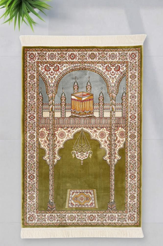 سجادة حرير تيموري بتصميم مستوحى من تراث مكة والمدينة، تعكس جمال الفن الإسلامي وتوفر راحة فائقة في كل صلاة.