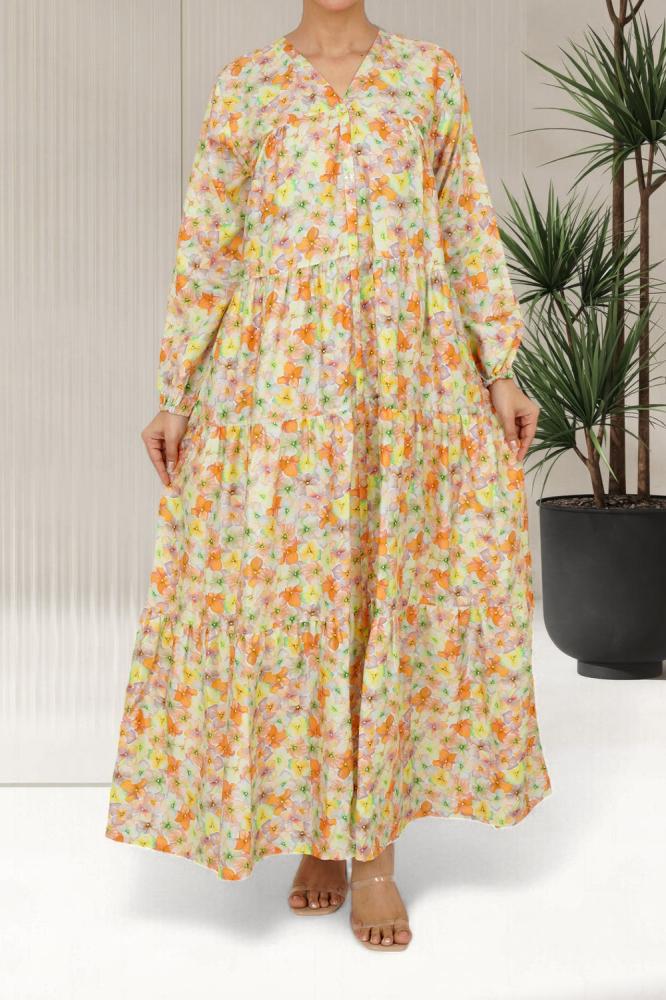 يتميز الفستان بتصميم فضفاض وانسيابي يمنح حرية في الحركة، وأكمام مطاطية تضيف لمسة عملية وأنيقة.