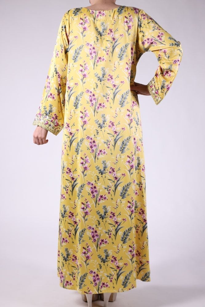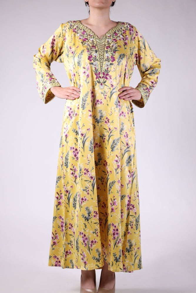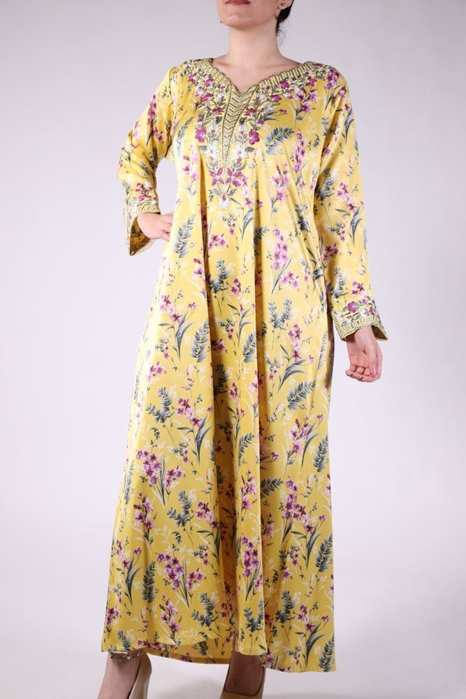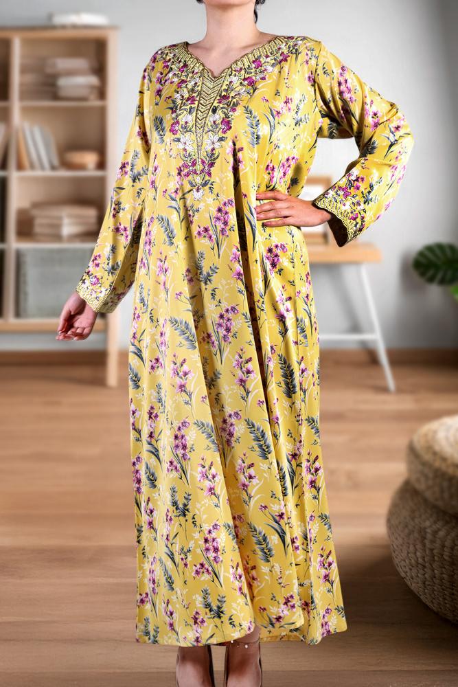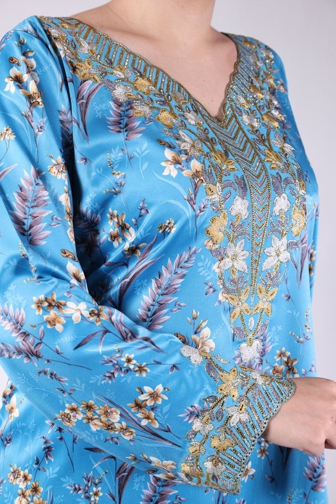 يتميز بتصميمه الفريد الذي يجمع بين النقوشات الرائعة والتطريزات الجميلة مع لمعة طبيعية تضيف إلى سحره ورونقه. خامته الحريرية الناعمة تمنحك الراحة والأناقة، مما يجعله الخيار المثالي لمناسباتك الخاصة.